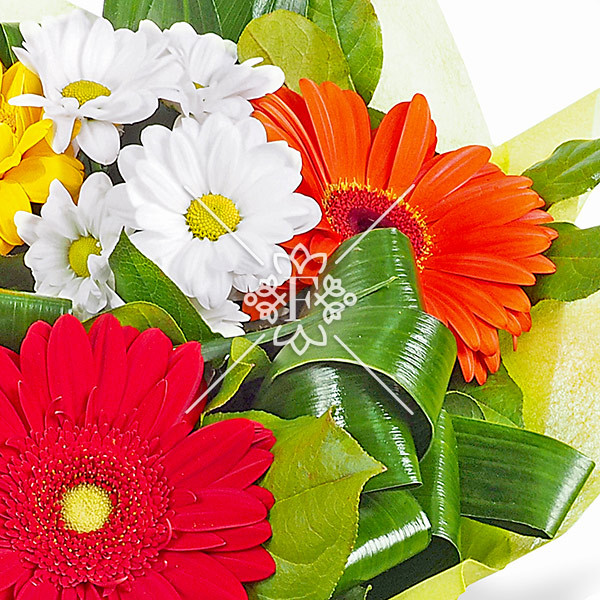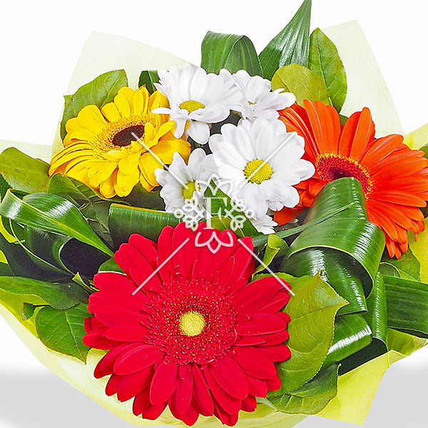 Микс гербер ярких оттенков, разбавленных нежностью белых хризантем, дополненных зеленью, будет радовать своей красотой длительное время.